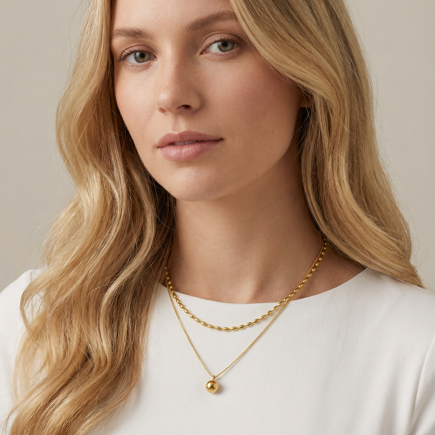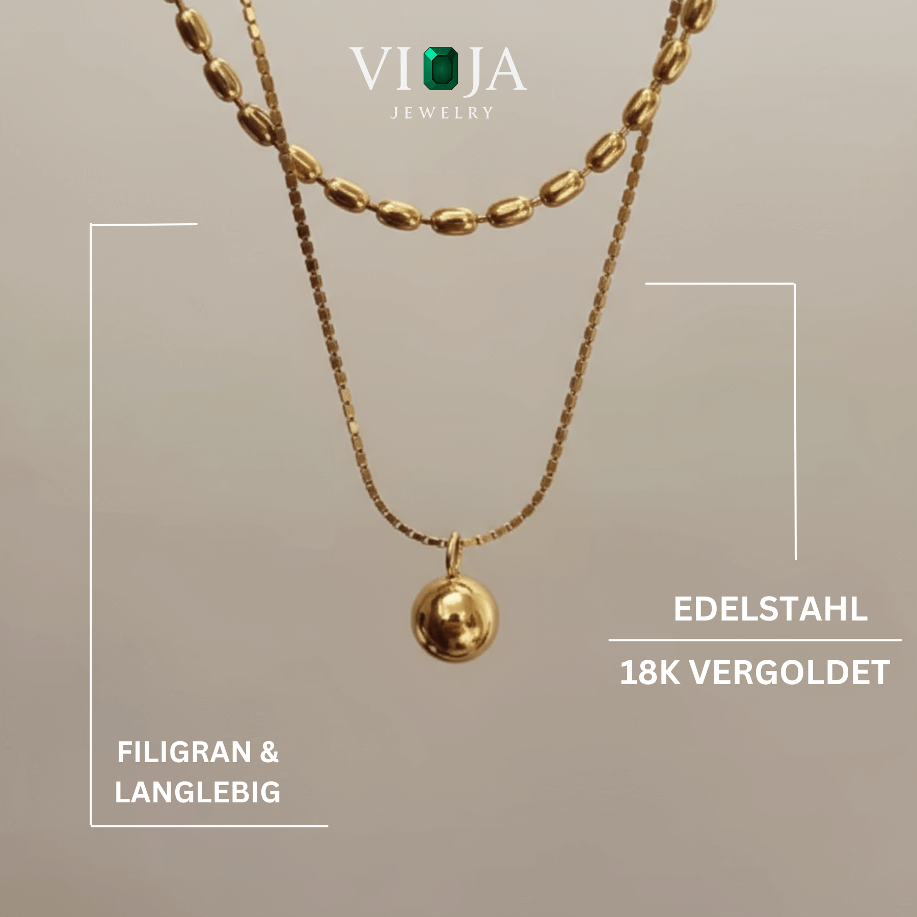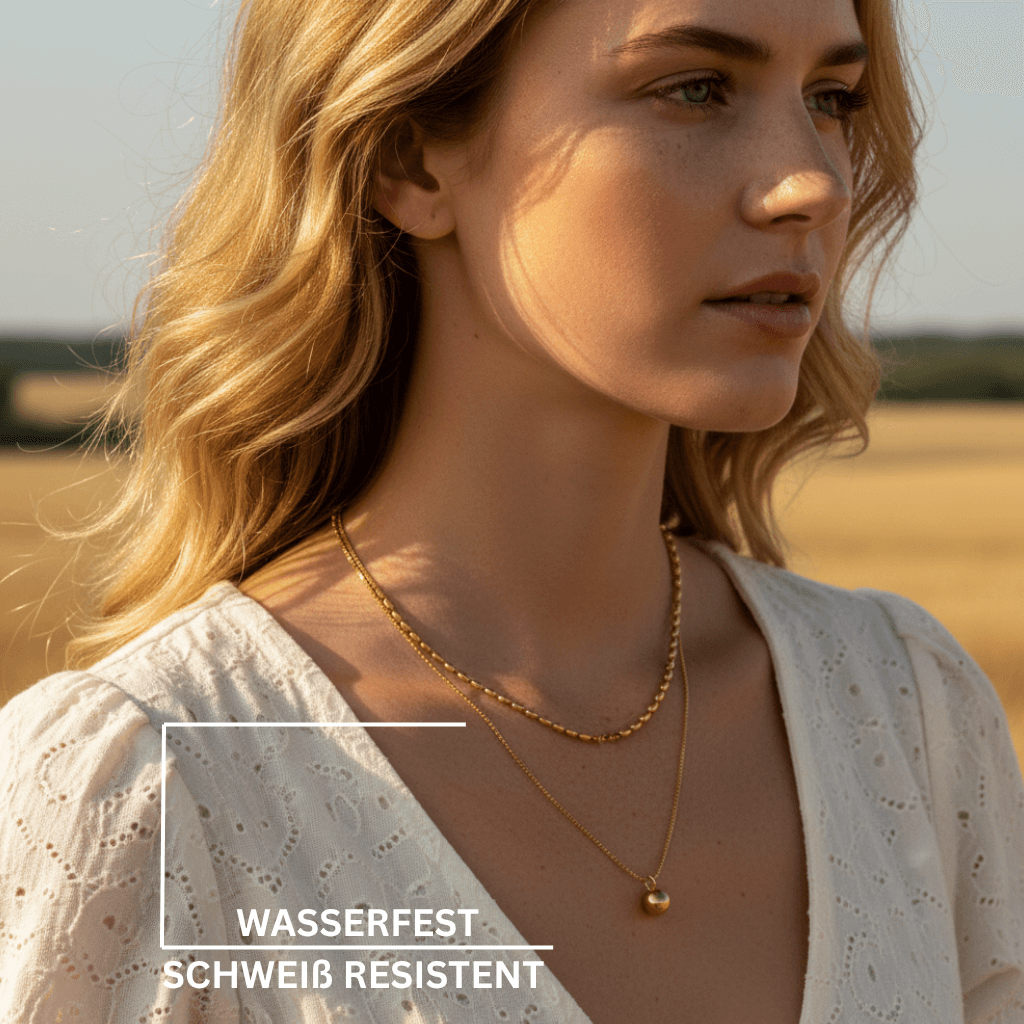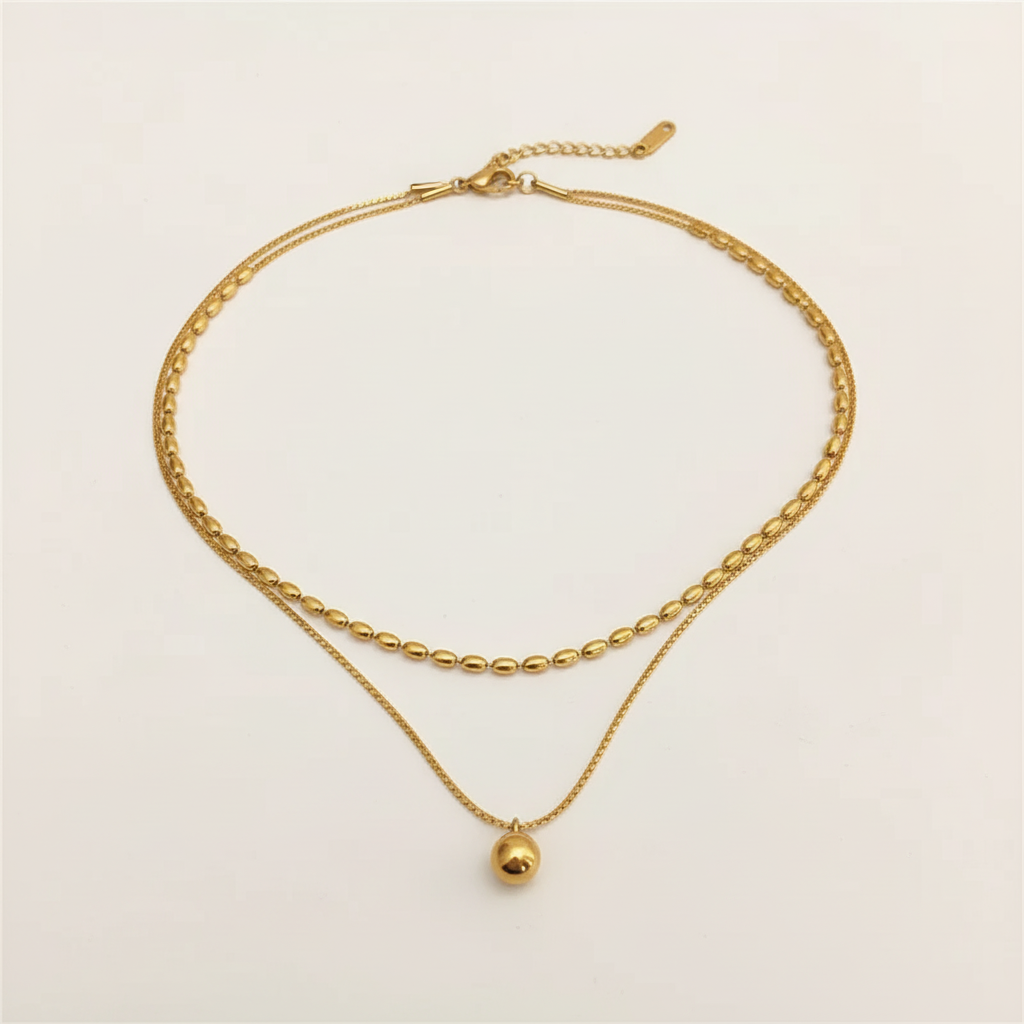 Die Véla Double Halskette besticht durch ihre feine doppellagige Kettenstruktur und den dezenten Kugelanhänger – ein minimalistisches Statement für stilvolle Leichtigkeit.