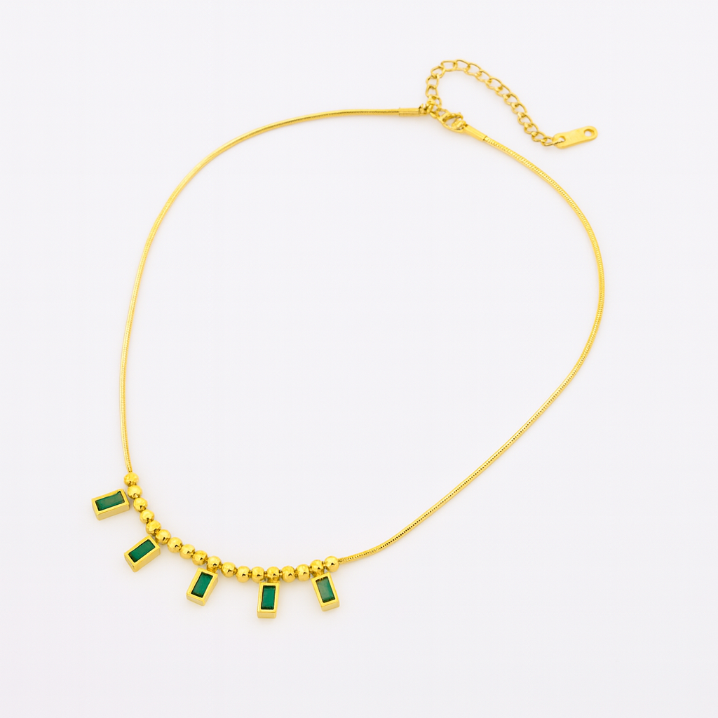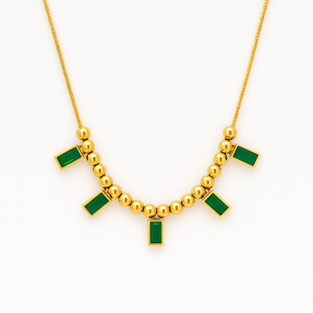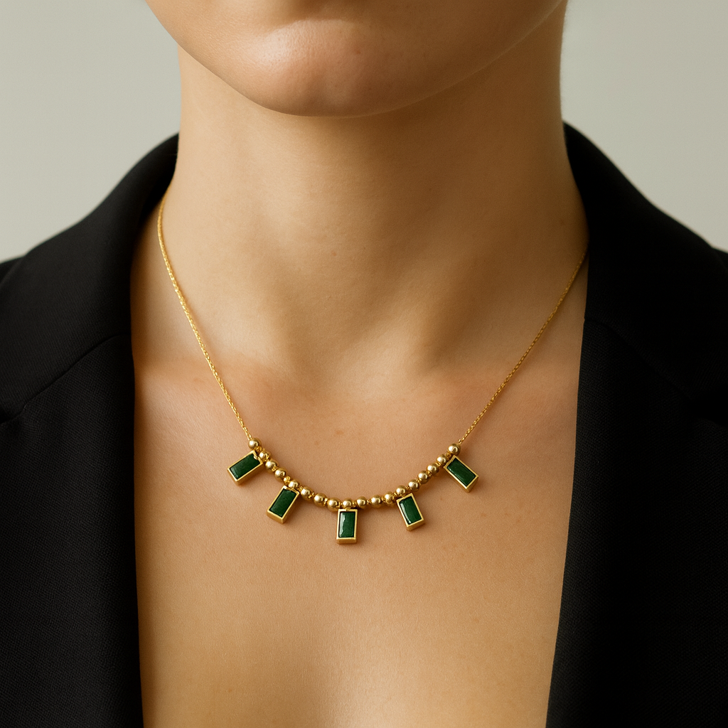 Die Waldlicht Halskette kombiniert fünf smaragdgrüne Kristalle mit goldenen Kugeln zu einem harmonischen Spiel aus Farbe und Form.