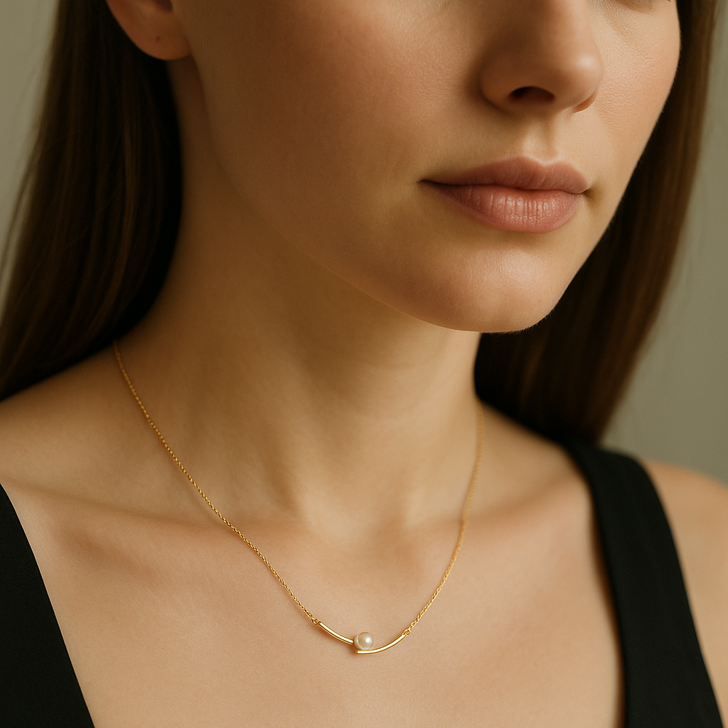 Eine einzelne, schimmernde Perle ruht auf einem sanft geschwungenen goldenen Element und schafft eine harmonische Balance zwischen Modernität und Klassik.