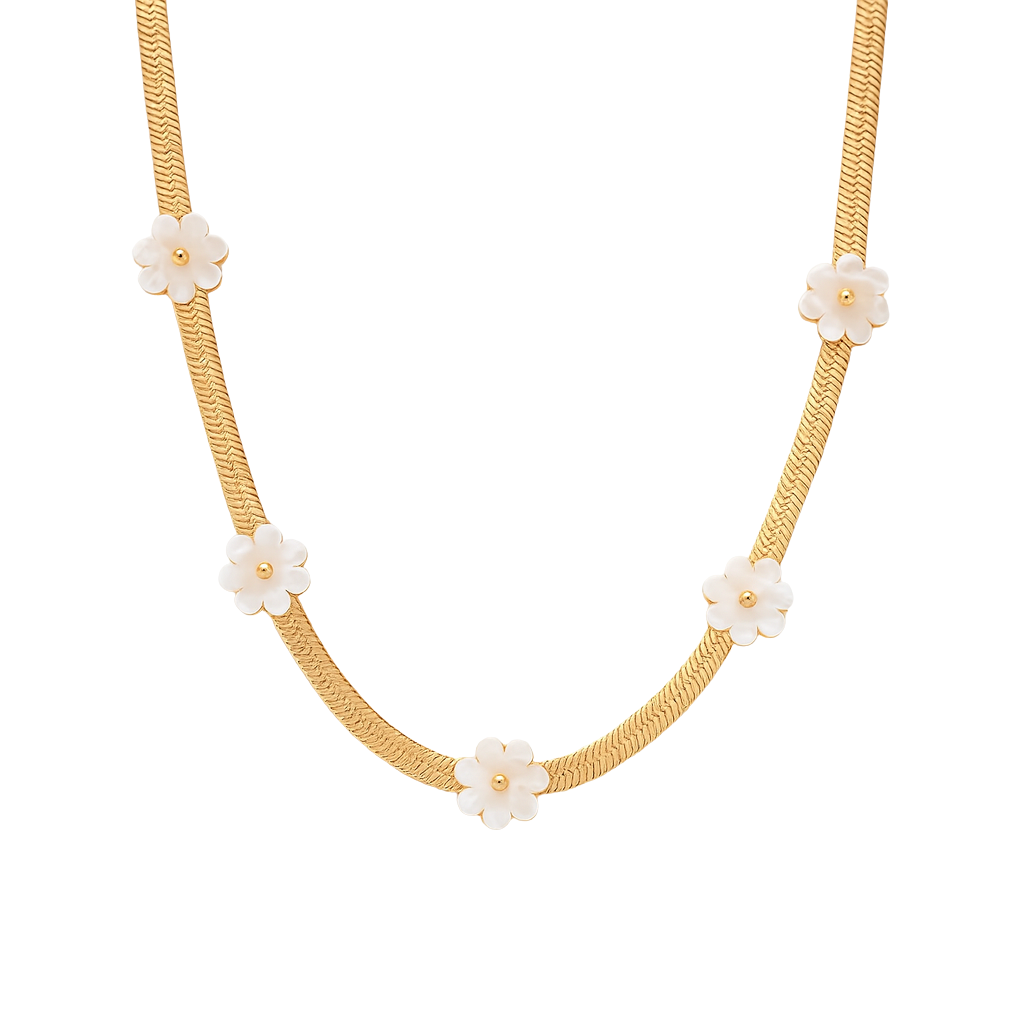 Eine zarte Schlangenkette aus vergoldetem Edelstahl trägt fein gearbeitete Blüten aus schimmerndem Perlmutt, die im Licht sanft reflektieren und jedem Look eine edle Note verleihen.