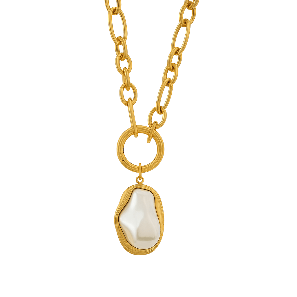 Eine vergoldete Gliederkette trägt eine schimmernde, unregelmäßige Perle – inspiriert von echter Barockform.