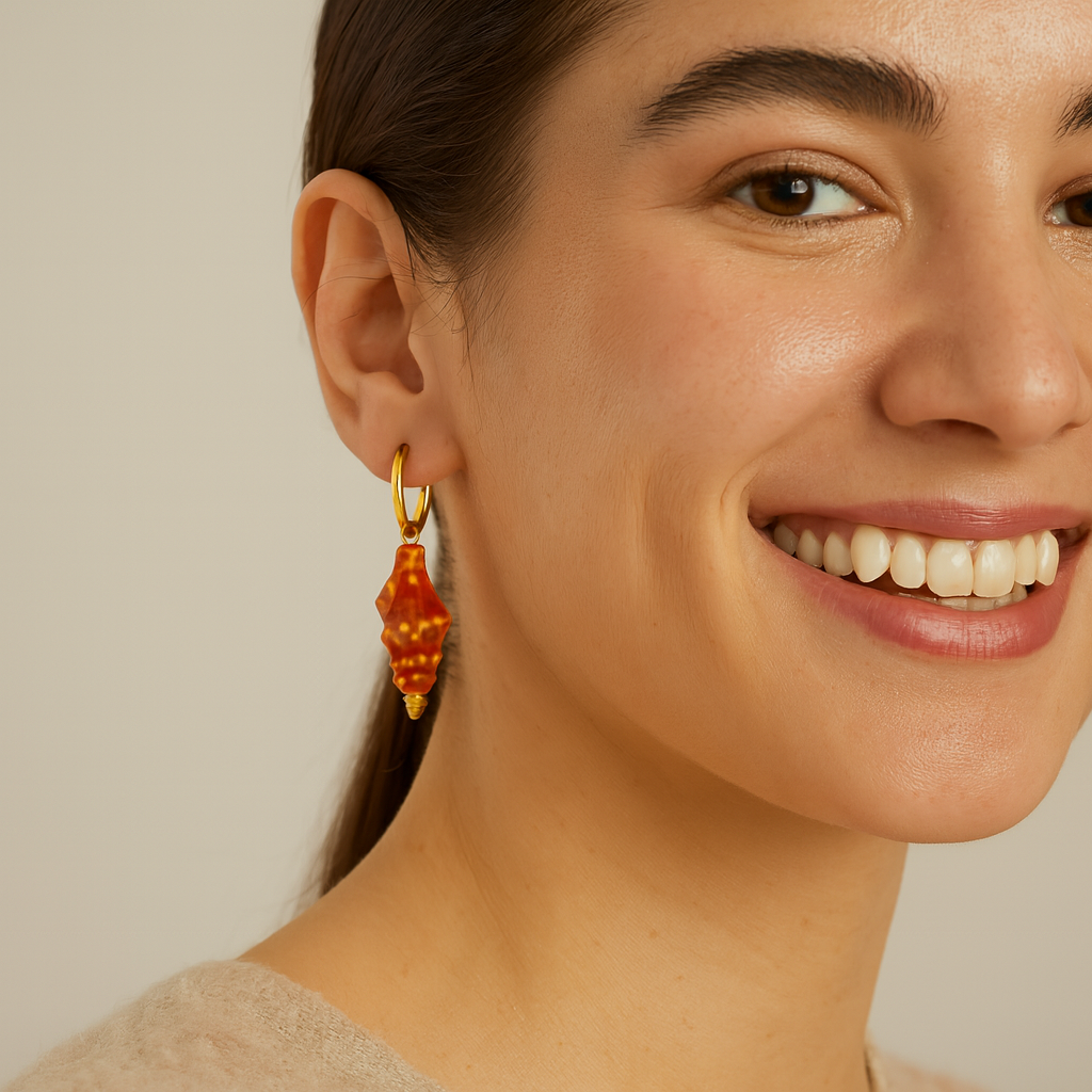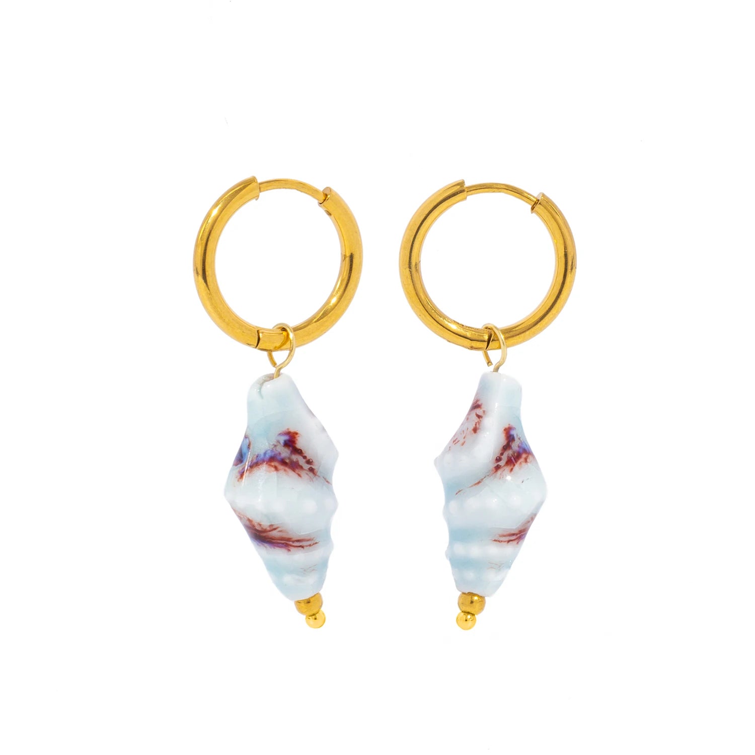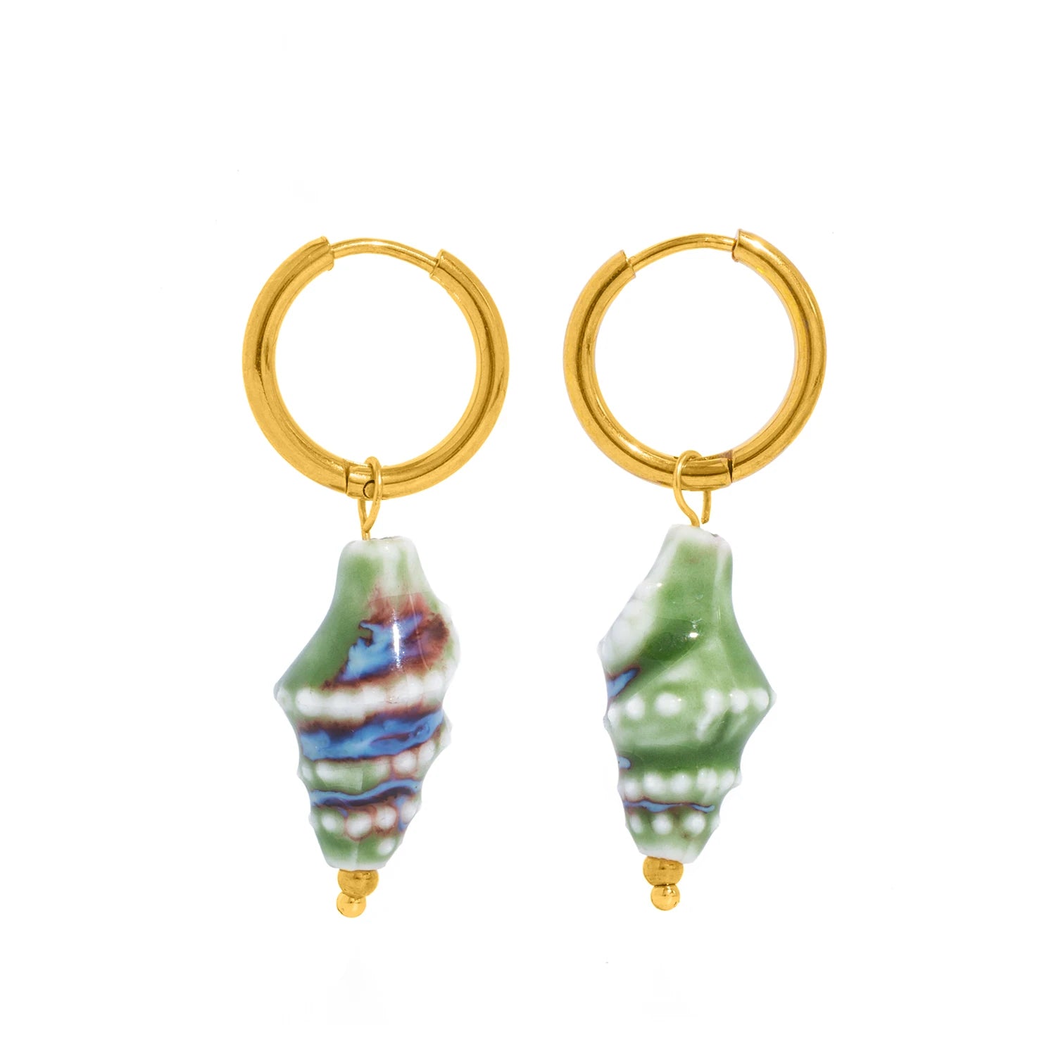 Die Conch-Pendant Ohrringe kombinieren bunte Keramik-Muschelanhänger mit feinen, 18K vergoldeten Edelstahl-Creolen.