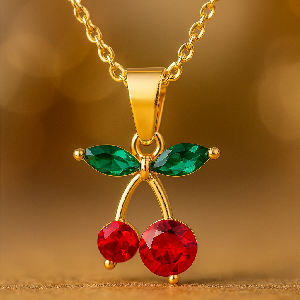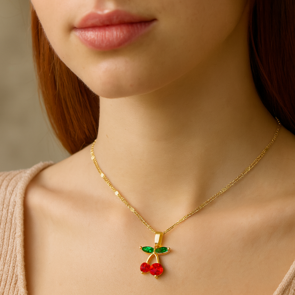Die Cherry Love Halskette mit funkelndem Kirsch-Anhänger verleiht deinem Look frische Eleganz und einen Hauch Romantik.