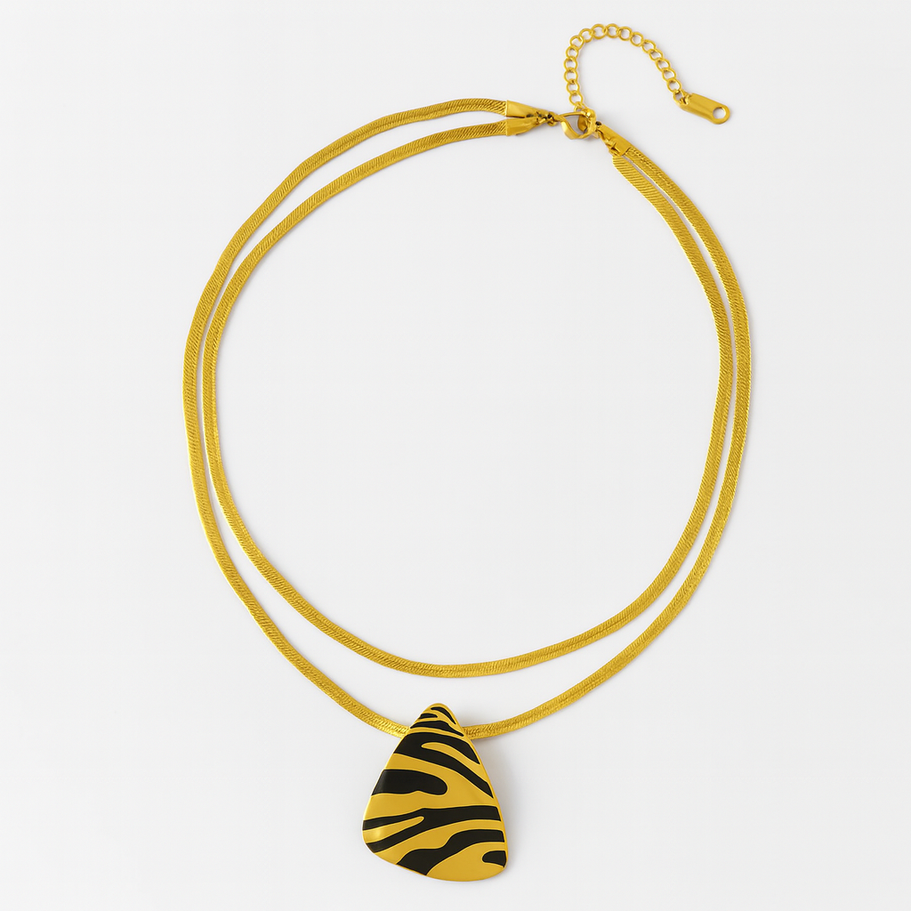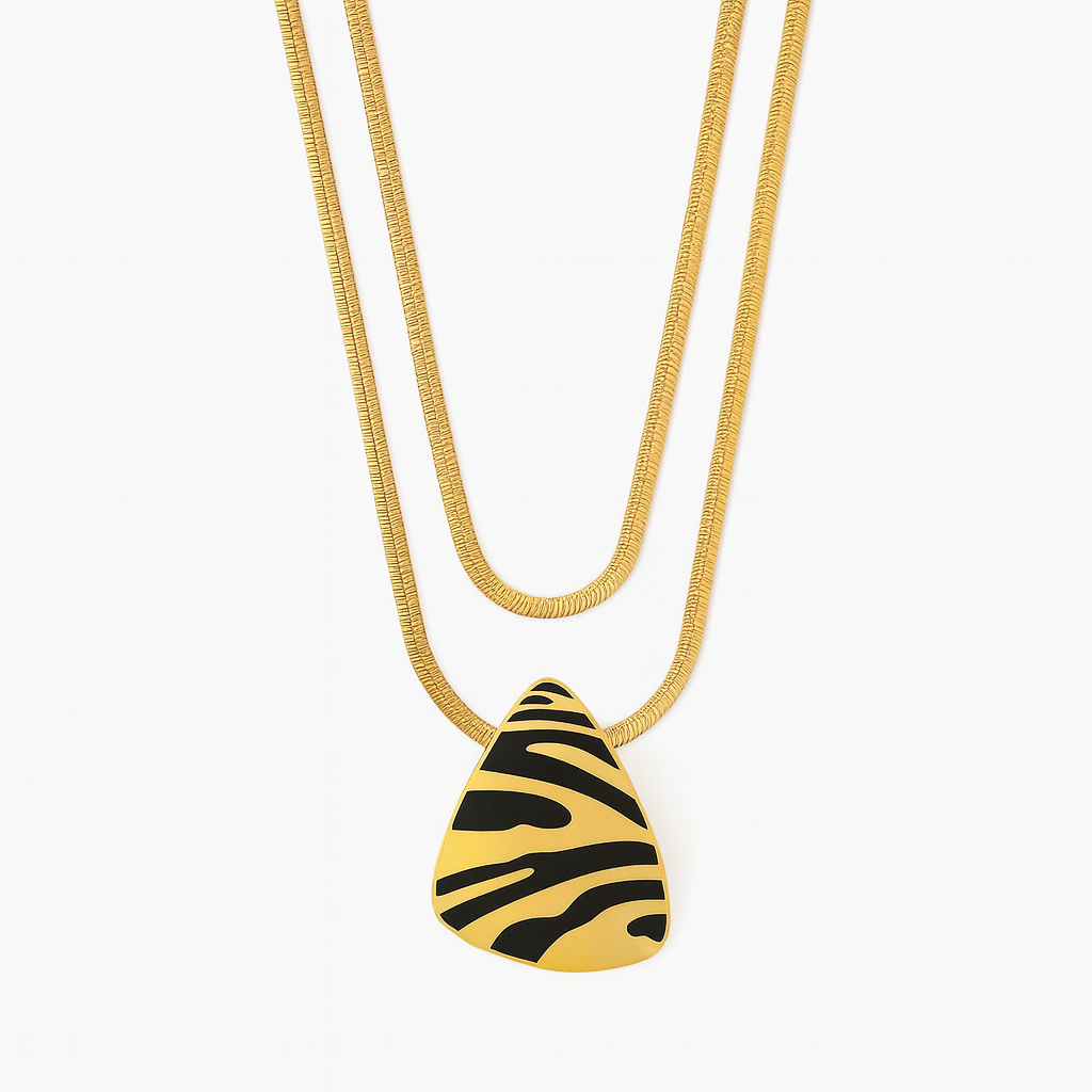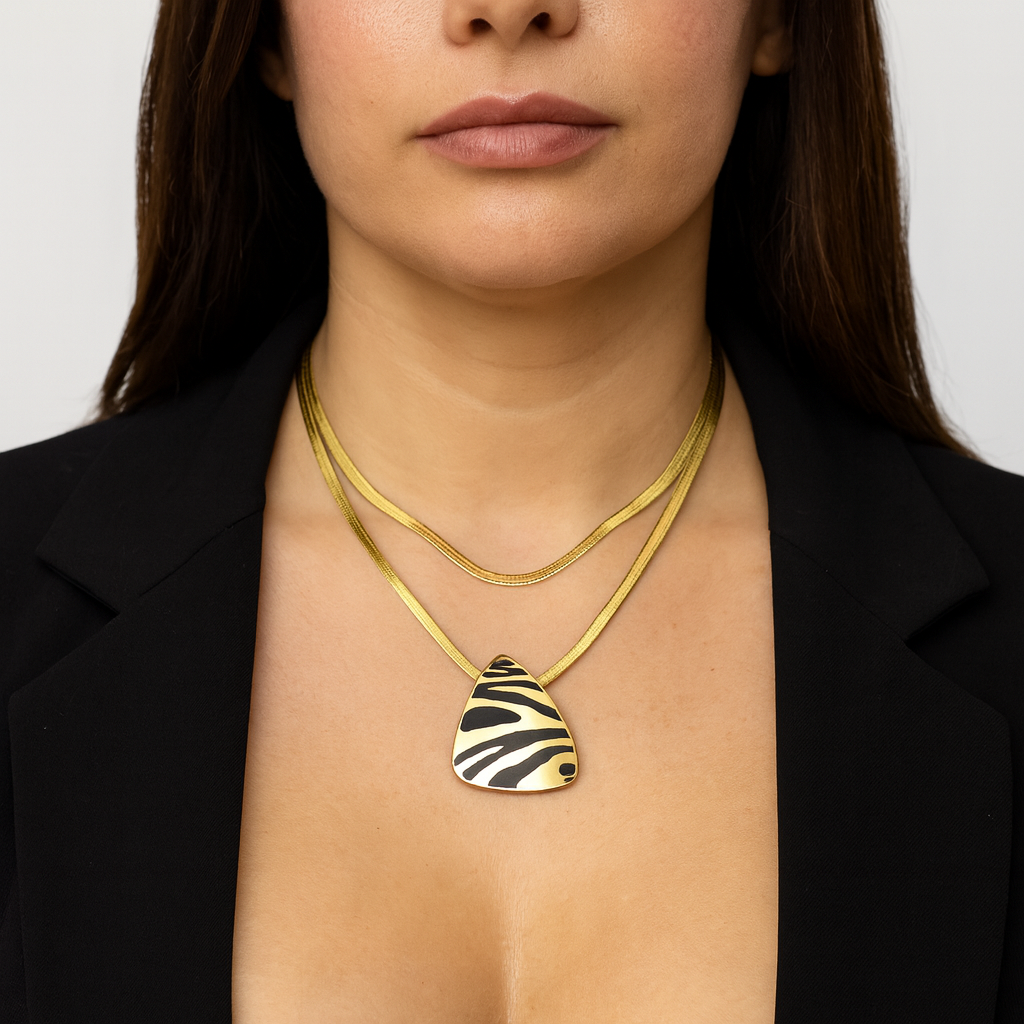 Die Savanne Halskette mit gold-schwarzem Animal-Print-Anhänger erinnert an die wilde Schönheit der Natur und verleiht jedem Look eine Prise Abenteuer.