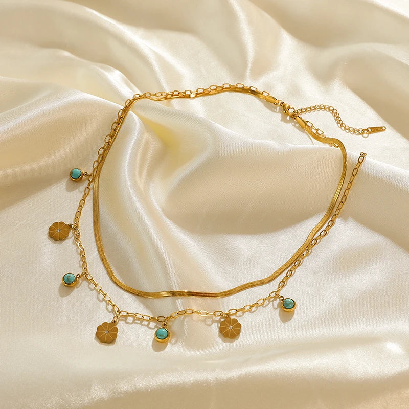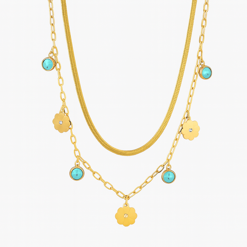Goldene Glieder, kleine türkisfarbene Steine und zarte Blütenanhänger setzen lebendige Akzente.